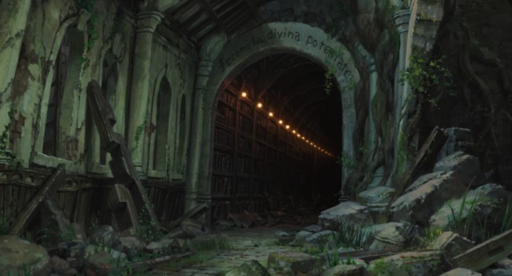 Here Miyazaki texturally, metatextually begins to sketch out the film as his very own Divine Comedy of sorts, fast-and-loosely structuring Mahito’s journey through the underworld in search of Natsuko after Dante’s seminal work, even if notions of an afterlife here are sharply distinct from the Inferno, Purgatory and Paradise of Dante’s design. I’m not pointing this out because Miyazaki is secretly adapting The Divine Comedy exactly; I’m not interested in finding these connections to “explain” the film. I just find it interesting that he’s taking our cultural understanding of that work and recontextualizing it; he’s signaling and shifting Kimitachi wa Dō ikiru ka toward the allegorical much more than his previous works.
