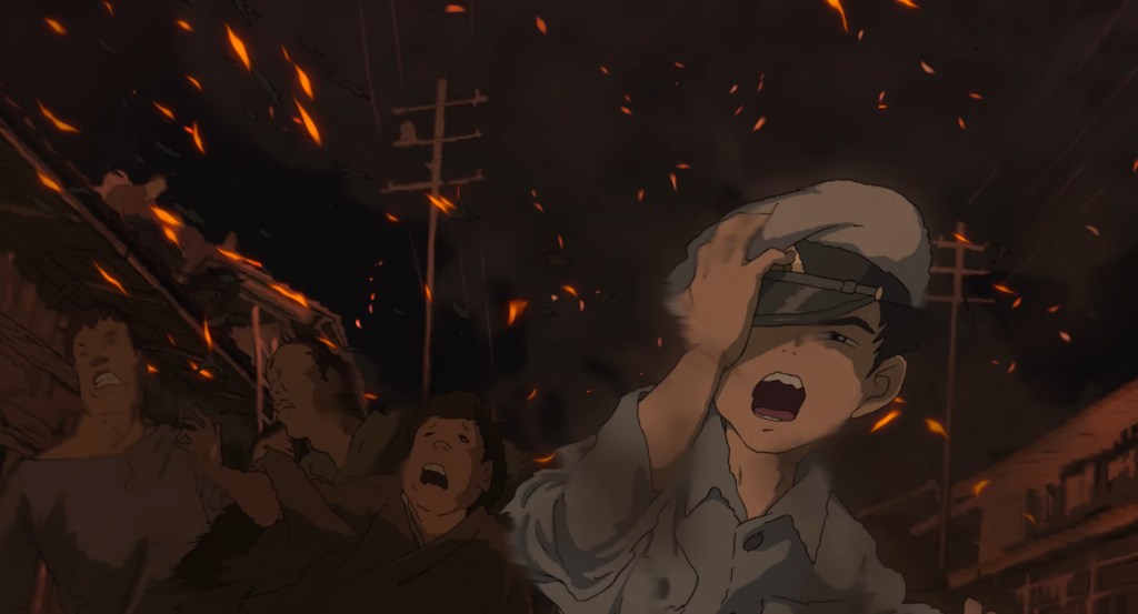 Kimitachi wa Dō ikiru ka, localized as The Boy and the Heron in English, was supposed to be Miyazaki’s last film. The first thing the moviegoer sees after the comforting sky-blue Studio Ghibli title card is an air raid siren against a charcoal-black sky. Twelve-year old Mahito awakens to one of the many Tokyo air raids that ravaged Japan in the Pacific theater of World War II. His father Shoichi tells him that the nearby hospital is on fire. His mother is there. Mahito darts toward the fire in a frenzy, his face grotesquely twisting and morphing as he jostles his way past expressionistic, horrific Edvard Munchesque muddy blurs of human beings in a mind-blowing sequence. He finds the hospital burning down before his very eyes. It’s intense, precise in its bleakness, and virtuosic in a way that somehow feels more exacting and humbling than indulgent.