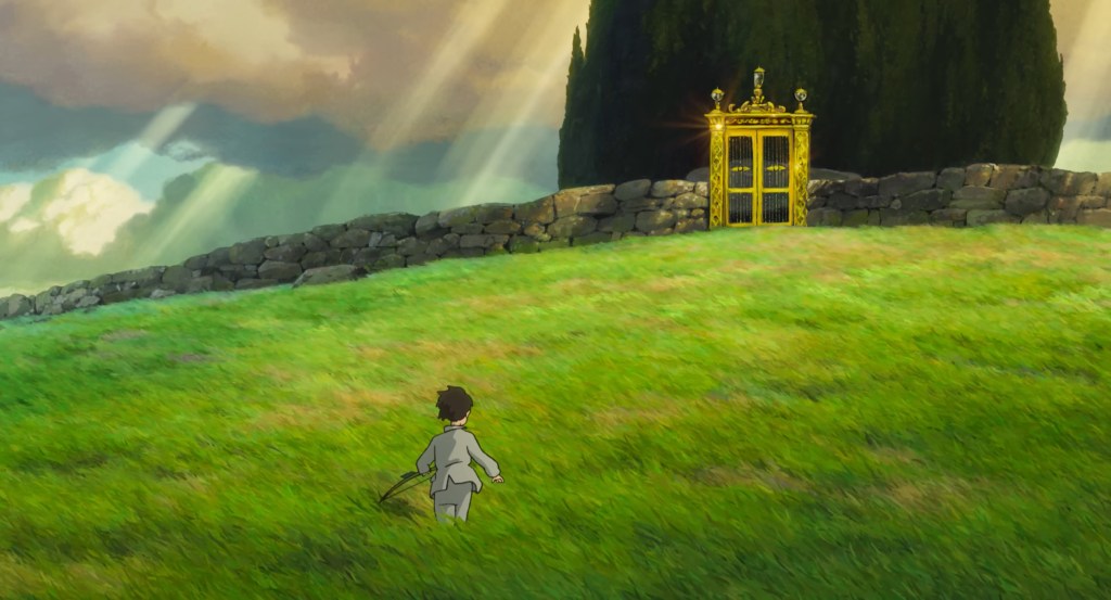 And the movie is like Spirited Away somewhat; as you’d expect, there’s always a decent amount of overlap between all of Miyazaki’s films. Like My Neighbor Totoro, The Boy and the Heron involves a young child leaving Tokyo with their family and moving somewhere more remote, to the inaka (田舎) or the Japanese countryside. Stories involving people from Tokyo going to the inaka are a genre unto itself, and it certainly isn’t unfamiliar territory for Studio Ghibli. Again, My Neighbor Totoro comes to mind, but there’s also Takahata’s Only Yesterday, which follows Taeko, a 27-year old woman from Tokyo, taking vacation days from work to travel to the inaka to work in the safflower fields and live there as a passionate curiosity, finding herself reminiscing about her childhood, her reflections rippling back to the present. Gravely, in The Boy and the Heron, Mahito’s family travels to the inaka not as a vacation, but out of obligation and evacuation. I couldn’t help noticing Mahito’s aunt and future mother Natsuko’s home is so Western in its design compared to the rest of the estate, but the setup feels familiar, a suggestion of a callback here and there to his older films, yet not quite. Like Spirited Away, the child stumbles upon another world separate from their reality. In that movie, Chihiro is thrust into the spirit world minutes into the film with the help of Haku, but the lead up to Mahito stepping through the threshold into another world is a slow burn, filled with moody transitions and bolder cuts that question the viewer’s grasp on what’s real. The heron ominously pesters and beckons Mahito, growing paradoxically more anthropomorphic and monstrous, toward the other world suffused with beauty, whimsy, and imagination.